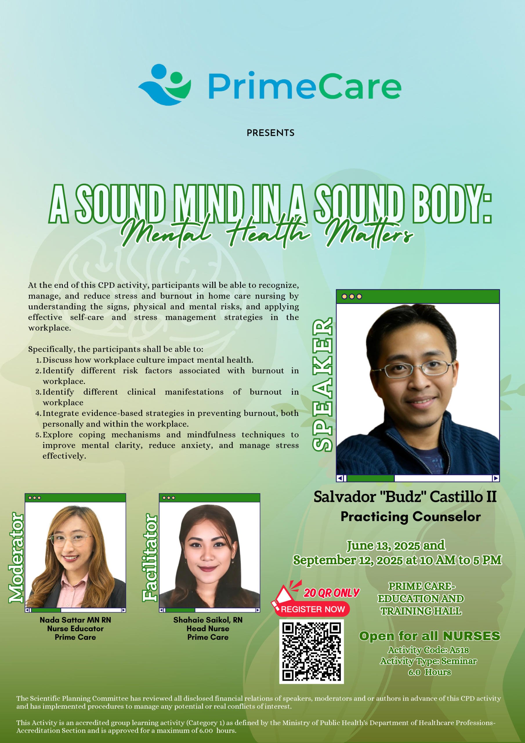 As the sessions concluded, a post-test was administered to assess knowledge gained throughout the activity. The SPC team presented Mr. Castillo with a token of appreciation, recognizing his valuable contribution to the program. Closing remarks were delivered by Dr. Abdulkarim Agga, Head of the Education Department, who emphasized the vital role of mental health support within the healthcare sector. He reminded everyone that caring for caregivers strengthens the very foundation of the healthcare system, stating, “When we invest in the mental health of our nurses, we not only protect our caregivers but elevate the entire healthcare system. A healthy nurse leads to a healthier community.”