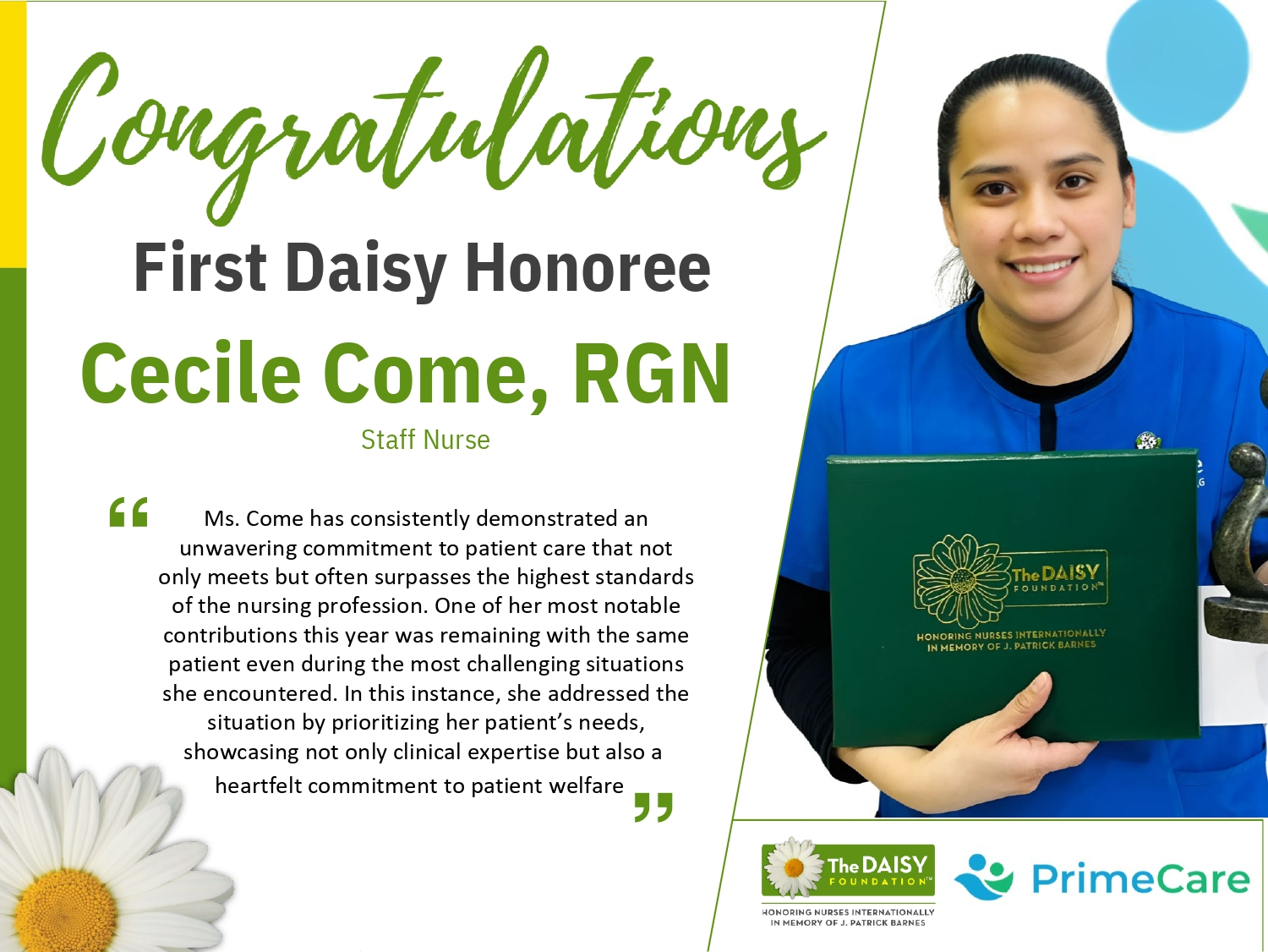 Prime Care is proud to honor Ms. Cecile Come as our first-ever recipient of the DAISY Award, a recognition reserved for those who exemplify extraordinary commitment, compassion, and dedication in the field of nursing.